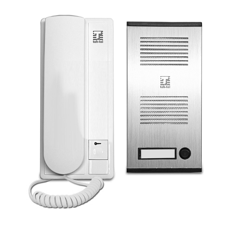 Teh-Tel audio interfonski komplet za jednog korisnika. Model interfonskog kompleta je SUPER STRONG 1. Na slušalici koja je bele boje se nalazi taster za otvaranje vrata. Poseduje i RFID čitač tagova koji radi na 125 MHz kao i 5 ključeva za korisnike i 2 administratorska ključa za programiranje. Pakovanje sadrži uputstvo na srpskom jeziku, kao i šemu povezivanja, tako da je montaža prilagođena ugradnji po sistemu “uradi sam”. Za otvaranje električne brave nije potreban dodatni trafo. Spoljna jedinica je metalna i predviđena za ugradnju na zid. Slušalica se povezuje bez polarizacije.