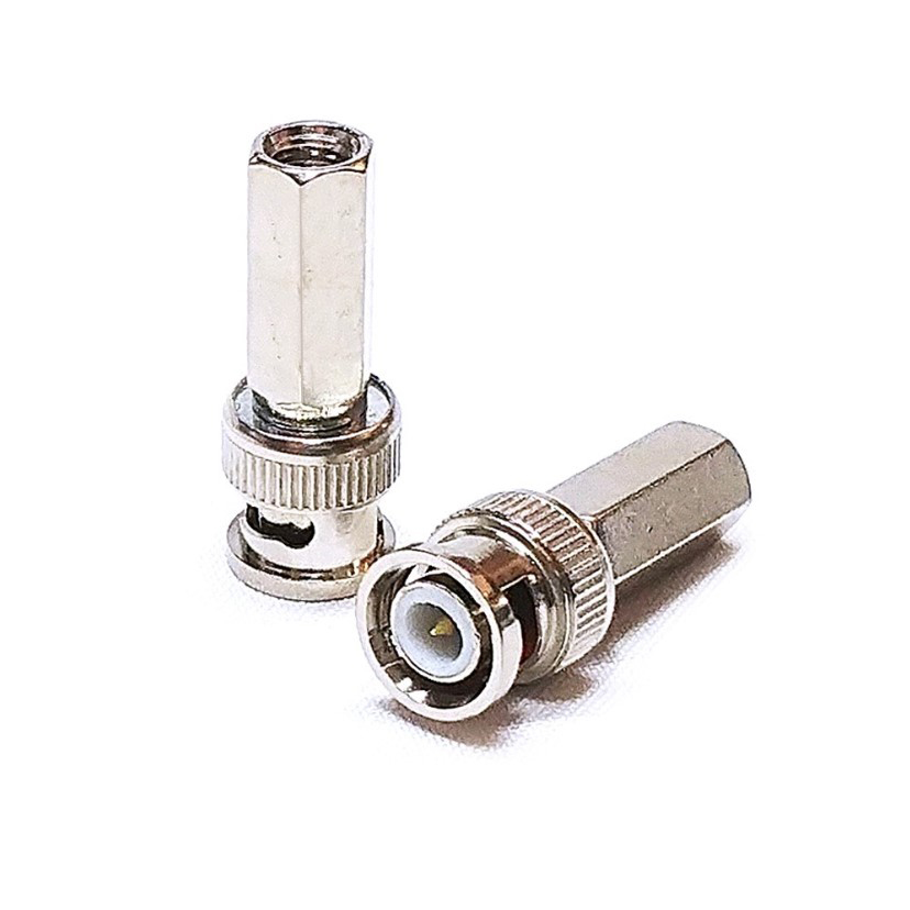 Konektor BNC muski za prenos video signala u sistemima video nadzora. Model “na uvijanje”. Za namestanje konektora na koaksijalni kabl nije potreban apsolutno nikakav alat. Nakon blankiranja zice konektor se rucno navija na kabl. Pin je vec ugradjen u konektor i nije potrebno krimpvanje pina. Ovaj BNC konektor na uvijanje odgovara RG 59 kablu.